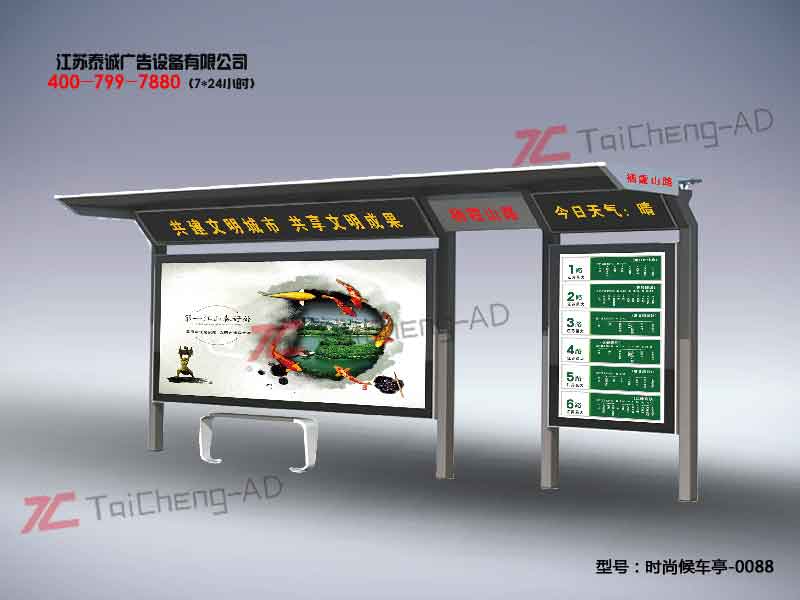 歡迎光臨江蘇泰誠設(shè)備科技有限公司 公司專業(yè)生產(chǎn)定做公交站臺、候車亭,宣傳欄,標(biāo)識標(biāo)牌等系列產(chǎn)品!